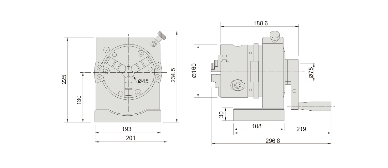 ● 三爪易於夾持工件,拆卸容易,使用方便快速。● 附有反爪配件可供較大外徑工件的夾持。■ 規(guī)格:● 中心高度:130mm● 分割24等份、分度15度.±5"● 貫穿孔直徑:φ45mm● 三爪卡盤孔徑:φ45mm● 三爪重複精度:0.015mm● 最小夾持直徑:外徑φ4mm. 內(nèi)徑 φ48mm● 最大夾持直徑:外徑φ160mm. 內(nèi)徑φ150mm