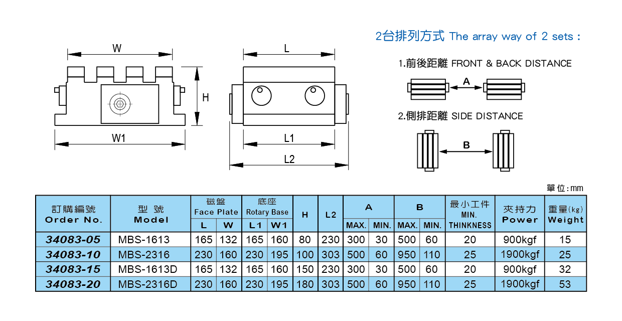 ● 將磁極分開以減少鐵屑的吸附及分散操作時的扭力。● 擁有強磁 / 弱磁兩段式開關可應用,方便讓工件調整位置及精銑或精磨的加工作業(yè)。● 附有替換式中碳鋼材質導磁條,可於加工時修整及鑽銑等多功能使用。★ MBS型為單面吸磁,適合用於較少移動變換的定點位置加工,固定方式使用壓板固定於工作臺上即可。★ MBS-D型為雙面吸磁,其特點為上、下兩面均可獨立操作,將磁盤放置於工作臺上後可利用下方的吸磁面固定,以節(jié)省移動時螺絲固定時間,若使用在重切削上,則可加上壓板固定,雙重保障。